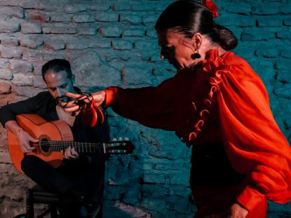 If you visit a tablao, you’re likely to watch a mix of choreographed routines as well as improvised dance. The latter is more true to flamenco’s origins, where the performance is like a spontaneous conversation. Laura Guastini Pereyra, a dancer from Argentina, has been living in Seville since 2012 and now is performing every night at La Milonga tablao.