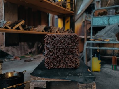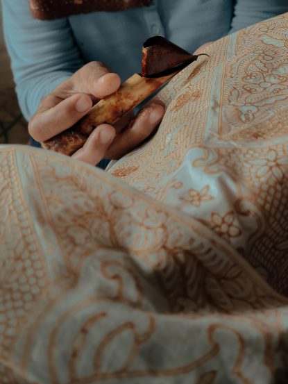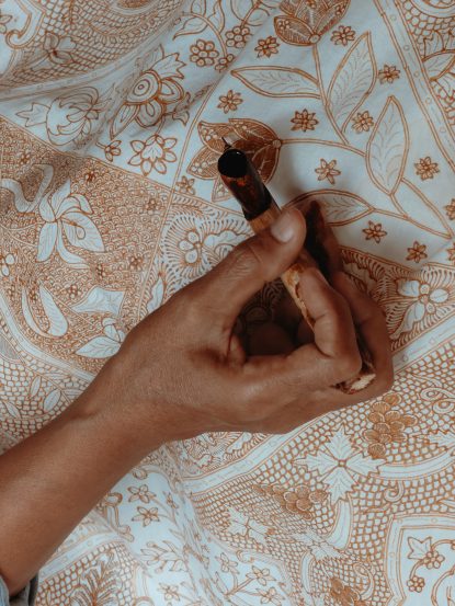 Batik techniques are also evolving with time. Traditionally, there have been two types of batik techniques: Tjanting (hand painting) and cap (stamped painting). With batik cap, motifs are created using copper plates, which are used to stamp wax on the fabric. Since 2016, batik cap artisans started creating sustainable stamps out of glue and cardboard, repurposing wastepaper from packaging like cake boxes.